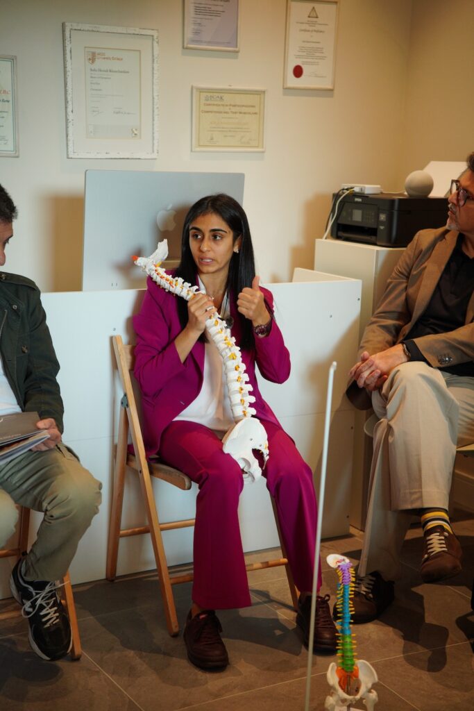 L’incontro è stato pensato come un dialogo interattivo di gruppo durante il quale pazienti, amici, passanti e conoscenti potessero sentirsi liberi di fare domande e conversare partecipando così al dibattito. Seduti a formare un cerchio, siamo partiti dal definire insieme cos’è una colonna vertebrale, mentre i modellini di colonne passavano da un partecipante all’altro per poter toccare con mano ed osservare da vicino questa curiosa struttura scheletrica. Grazie alle domande e risposte dei presenti, abbiamo scoperto insieme che all’interno del canale vertebrale – lo spazio protetto formato dalle vertebre – è custodito il midollo spinale, ovvero laprosecuzione del sistema nervoso centrale che origina proprio alla base del cervello. Così siamo arrivati a capire perché sia così fondamentale prendersi cura della propria colonna vertebrale: infatti questa ‘colonna portante’ contiene e protegge come una corazza il delicato ma essenziale midollo spinale che consente il passaggio di informazioni tra cervello (la nostra centralina) ed il resto del corpo (organi, tessuti, muscoli).